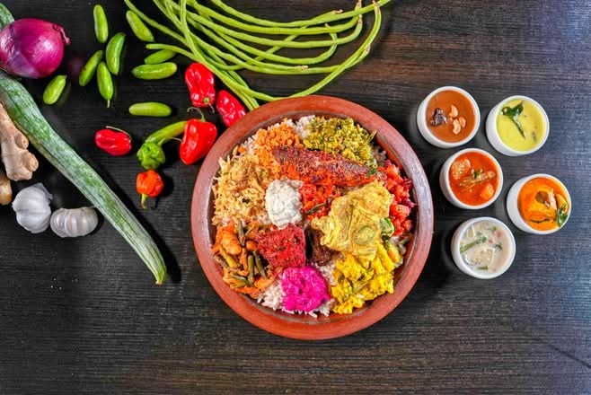 Rice, Kappa, Fish Fry, Chicken Fry, Thoran, Mezhukkuvaratty, Veg.Curry, Moru Curry, Sambar, Omlette, Pachadi, Kichadi, chammanthy, Pickle, Kondattom, Payasam
