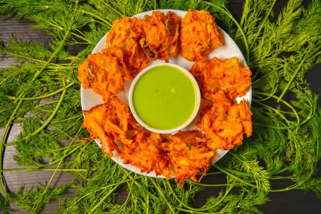 Sliced onions are mixed with a batter and deep fried served with a side of sauce